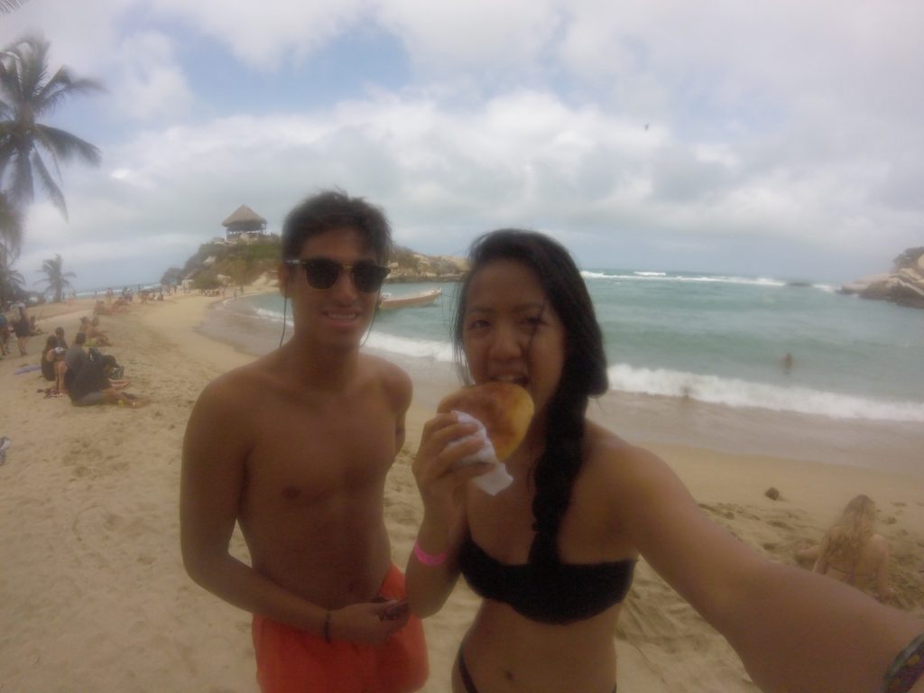 March 22, 2017 | Leave a comment I was hesitant on visiting the unique beaches of Tayrona National Park because I didn’t want to deal with such a large volume of tourists, but according to the bathroom wall of The Journey Hostel, “The only impossible journey is the one you don’t take.” With the help of Inti, the founder of the hostel, we were able to enter through a side entrance, hike less popular trails, and on our extra days, we visited deserted beaches and lesser known waterfalls. Tayrona National Park, PC- Chris Getting There From Santa Marta, we took a bus from the terminal to The Journey Hostel, $5.20. The hostel is a 15-minute walk from the main entrance of the national park (Zaino), or a short colectivo ride to the side entrance (Calabazo). Accommodation Despite staying at the famous Casa Elemento and Casa en el Agua hostels, my favorite hostel in Colombia was The Journey Hostel. Inti was inspired by Casa Elemento and as an architect, he built his own dream (quite literally, from scratch).Still incomplete, all our facilities were new and beautifully designed. Yes, we showered under bamboo spouts. $10 dorms and $26 privates overlook the jungle and ocean, which are both technically the edge of Tayrona. I found myself sleeping eye-to-eye with songbirds. Dinner was served family-style, $4, and a kitchen for guests was coming soon. The Journey Hostel See and Do The Monkey Walk Day 5 After getting lost in a forest of coconut palms we knew we were back on track when we found ourselves gazing into the intelligent eyes of howler monkeys. We stayed on the quiet beach and sandy boulders all afternoon. The idea of a super fresh tuna salad was what ultimately brought us back to Journey. Afterwards, we watched the sun set behind a distant mass of vegetation from the concrete frame of an unfinished building. The beach at the end of the Monkey Walk. Tayrona National Park Tickets were $3 for students presenting a valid ID, and $15 for foreigners. Don’t be like us and have half the group forget that we needed to show our passports and walk back to the hostel to dig them up. The five of us took a colectivo bus (it’s blue, green, and white) for $.67 to Calabazo, a small village with a side entrance to the park. Even though it was only the fifth day Tayrona had reopened to the public after being closed all February, there were no other tourists here and therefore no queue. We followed signs for Cabo San Juan (3-4 hours), passing through the indigenous village of Pueblito along the way, before passing through La Piscina and Arecifes along the beach, ending at the parking lot (2 hours from Cabo). A colectivo took us the the main entrance, Zaino, for $1 and we walked from there back to Journey. We did not realize ahead of time that at the parking lot was another short side trail called Nueve Piedras, which leads to a lookout. Dehydrated and tired, Chris and I decided to skip it, which is a shame. Don’t forget to check it out! I recommend doing all of this as a day trip and enjoying a real bed at night, since the second day all we did was hike out. The most popular place to rent a tent ($10) or hammock ($7) was Cabo San Juan—it looked like a tent city. The pricier and very limited gazebo hammocks were notorious for being freezing at night, and anyone is allowed to walk around them and enjoy view during the day. Less claustrophobic options were available in Arecifes, which is where we stayed. This was only a small but very popular chunk of Tayrona. There are other entrances closer to the town of Taganga, and I heard that Playa Cristal was beautiful. A note on history: “Tayrona” doesn’t sound Spanish because it’s not. It is the name of an indigenous population that was wiped out by colonialism. Four descendant tribes (Kogi, Wiwa, Arhuaco, and Kankuamo) still live in the Santa Marta area, including within the national park (i.e. Pueblito). There are often conflicts between the indigenous people and the government over the infringing eco-tourism, contributing to the frequent closures of the park. Cabo San Juan Day 6 The hike to Cabo San Juan was shaded and pleasant. The sudden density of tourists shocked Candice and I as we came up to a packed restaurant. Chris was waiting for us. We unanimously agreed not to stay here for the night. After watching them eat at the restaurant (I had my usual Clif bar), we swam, visited the gazebo, and walked the beaches. Still no sign of Parbs and Z. Candice convinced us that they must have turned around. After all, Parbs slashed the bottom of her foot on the boulders the day before. Moving on to Arecife, we showered, jumped in our hammocks, and suddenly were incapable of moving any more for the day. So three adults shared my last Clif bar and a small packet of tuna for dinner. Cabo San Juan- Colombian chocolate hot bread. Day 7 Leave it to me to drag a guy to the beach at 6am to nap while we waited for the lady running El Palacio de las Arepas to return. She taught me how to stuff arepas with eggs, or chicken and veggies. I say her cooking was authentic because the arepas were deep-fried in the same oil as the days before, sitting out in the open. And new dough was made and mixed with old dough. ***** “Why are all my friends dying?!” Chris found a tick in the shower and didn’t completely remove it. I had to ask Inti for tweezers and help. Candice, who had left early for a flight, was still recovering from food poisoning. Parbs and Z were still missing. We napped unworried, woke worried, and decided we would have to go asking Tayrona, just as a sketch sedan pulled up around 6pm. Our friends rolled out, drenched in sweat, and our eyebrows raised as they told us how they went all the way to Playa Brava. Chris was reunited with his Oreos that Parbs had been carrying the entire time. After delicious ribs for dinner nothing felt better than swinging in hammocks, enjoying the gentle warmth Northern Colombian air. That is, until the world came to a sta