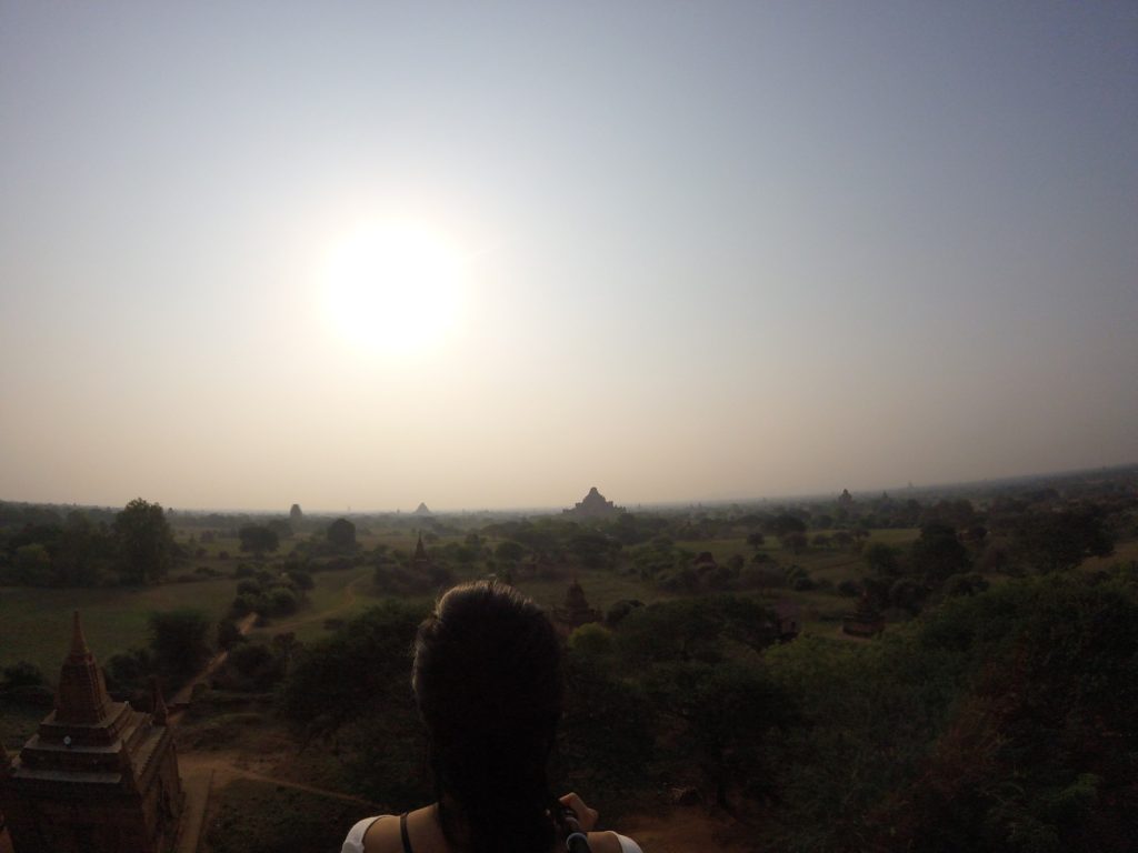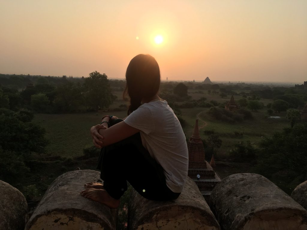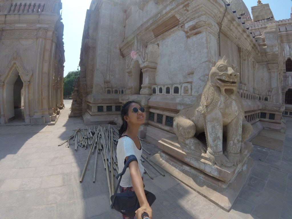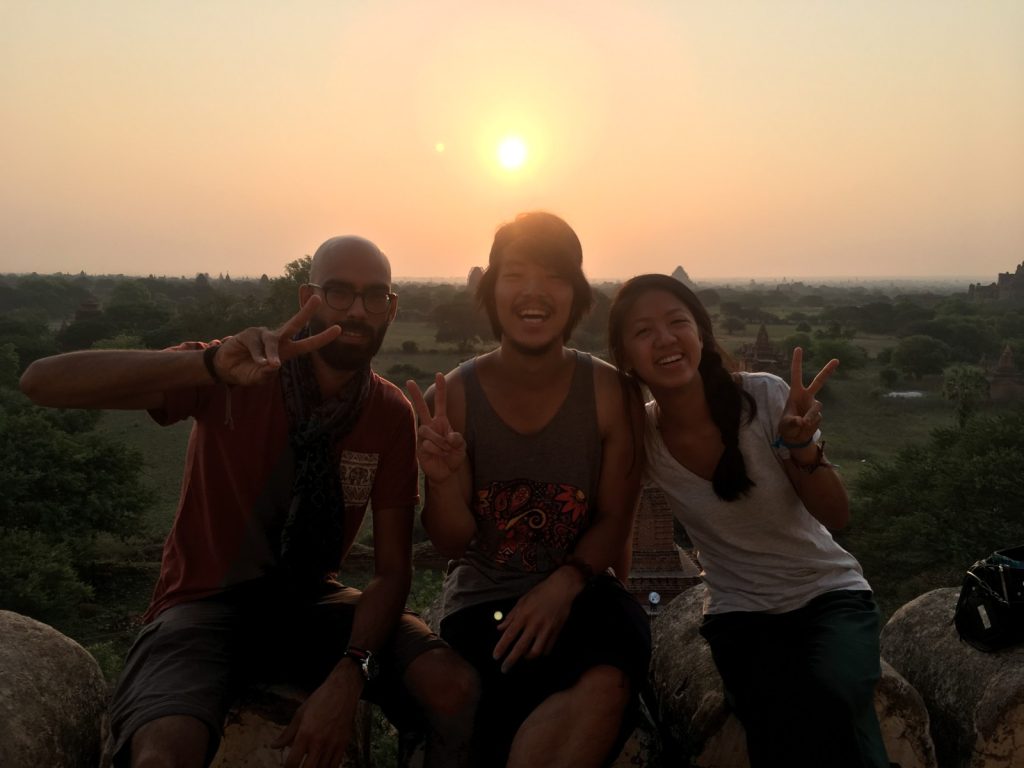 May 19, 2017 | 2 Comments 2,200 Buddhist temples dating back to the 11th century scatter across 26 square miles in a multitude of shapes and sizes. I had a wonderful time at this top tourist destination, and that was saying something considering two setbacks—May was during hot, triple-digit season, and most of the viewpoints were under restoration, severely limiting options for sunrise and sunset. The most popular way to tackle Bagan was to rent electronic bikes and start off-roading. Shwesandaw Pagoda Getting There and Away It was optimal to take the 8pm VIP overnight bus from Yangon booked through my hostel, 9 hours, $15. A taxi from the Bagan bus station to our lodging in New Bagan was $6 total, which was split four ways. Door-to-door bus service was offered to Mandalay, $6, 6 hours. I booked my ticket at Thandar E-bike Rentals (scooter rental $3 per day) with a travel agency called Snow. Many backpackers also came to and from Kalaw or Inle Lake via overnight buses. Accommodation The dorm in Bagan Central Hotel located in New Bagan was one of the cheapest options, $13. Good wifi, AC, lovely staff, breakfast was fresh and huge. Tickets and Tours Foreigners were required to obtain a $20 ticket valid for five days. Not everyone was stopped upon entry to buy it and not everyone was checked for having one. My taxi was stopped upon entering the archaeological zone. I was checked once in a temple. Ostello Bello Hostel does a tip-based guided tour from 7am-2pm, but I’ve had enough of these and lately the notion of time constrictions has started to stress me out. I needed my own time for meditating, finding local food, and GoPro play. However, friends who did the tour said it was incredible. Shwesandaw Pagoda See and Do Day 7 “Express” bus companies meant you fly through dirt roads. Mercilessly. It occurred to me that the majority of the world lives in wooden shacks and sells things out of wooden shacks. At night, roadside businesses of Asia, South America, and Africa are indistinguishable from one another. I feel like I’m in a constant aura of safety. It’s dangerous to get used to so I can’t. I think the children from travel brighten each my days. I try to take photos with them, or catch them in some sort of action. **** I learned how to scoot in five minutes flat. It was sweltering, but I got a dash of wind on the e-bike and the temples were shady. I really enjoyed Hannah’s company because we had one common aspect: she was another young solo female traveler who cared about the local culture. I followed her to climb a few ruins and to watch the hazy river. Day 8 It was easy to see how people here are so spiritual with sunrises like these. Furthermore, it was amazing how precious a steady breeze could be. It felt like a kiss from God. Slowly the others returned to their scooters but I clung to the restored red bricks for much longer. Shwesandaw Pagoda I found the carvings of Nan Paya to be admirable and the countless mini buddhas of Abeyadana to be dizzying. Somewhere along the way I thought I was purchasing a refreshing coconut but it was actually a palm fruit containing tasteless jellies you suck the liquid out of and chew and chew and chew on. Manuha Phaya was my favorite for an unexpected reason. Something subconcious prompted me to walk behind the temple, where a very old man holding a heaping plate of food waved me over and yelled at me to eat. It was purple rice mashed with some member of the legume family and tempura vegetables. He threw the spoon in my hand. I had a few bites and it was good. I couldn’t understand what he was yelling at me because again, I don’t speak wingdings, but it didn’t stop us from having a good time and laughing a lot. His friends walking by were just as entertained. I thanked him in Burmese and walked away, but immediately ran into a woman who knew some English. I dragged her back to him and had her translate. He was asking where I was from! And also accusing me of not eating enough: the essence of grandparent-ing. Then of course he shoved all the food in her face. I’m touched he didn’t want anything from me. His arms were the color of tar, he sported exactly one tooth, he wore sunglasses with “LACOSTE” printed on them, and he absolutely made my day. I had the best Burmese meal yet at a little spot I found by the Irrawaddy River that had no foreigners and no English. They only charged $1.50 for any type of curry with half a dozen sides and some soup. So full. Classic Burmese lunch. If yesterday’s blessing was the sunrise breeze, then today’s was a public restroom with TP right around the corner at just the right moment. Just traveler problems. Back in bed under the protection of my mosquito net, the door opened to let in a boy who looked fresh outta Osaka. He was hilariously flying through countries on a world trip during his gap year. We had him join us for sunset. I again plastered myself to the outer edge on the second floor of a temple. Everyone abandoned the site when winds picked up. Crap flew into my eyes as I tried to keep up with the others. My first Japanese backpacker card! It was personalized and listed all of Kento’s social media handles. A great idea that would be very obnoxious if adopted by any non-Japanese. Because the Japanese are just the Japanese. He showed us one of his Vietnam rap videos and I was dead. His rap name is OTNEK. Shwesandaw- Alex, Kento, and I. Day 9 Sunrise on Shwesandaw was crowded, but its beauty alone was enough to again make me feel grounded and present. By the end of junior year I had an obsession with taking walks. I loved circling the outside, and then the inside of temples. In the courtyard two young monks were wrestling. I could see their bony rib cages as their robes were ruffled. A boy with a face full of thanaka led me through stair passages in Dhammayangyi, pointing out the streaks of bat droppings that nearly smothered the walls. I was starving after Sulemani. I sped back, t