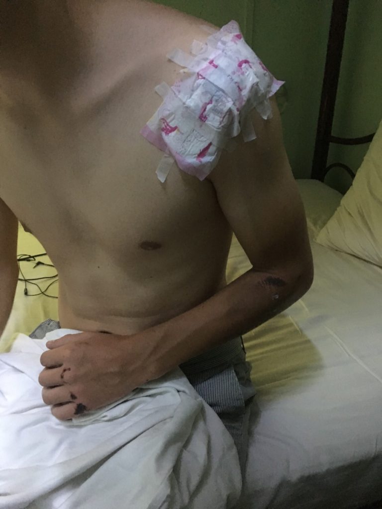 Now, the only reason Harry wasn’t already on that train was because he had the munchies two nights ago, took a motorbike too fast down a hill, and shredded his left side up a bit. And using my desire to be a physician as his argument, I had to help replace his shoulder bandage, only I had none, so we taped him up with a female sanitary pad.