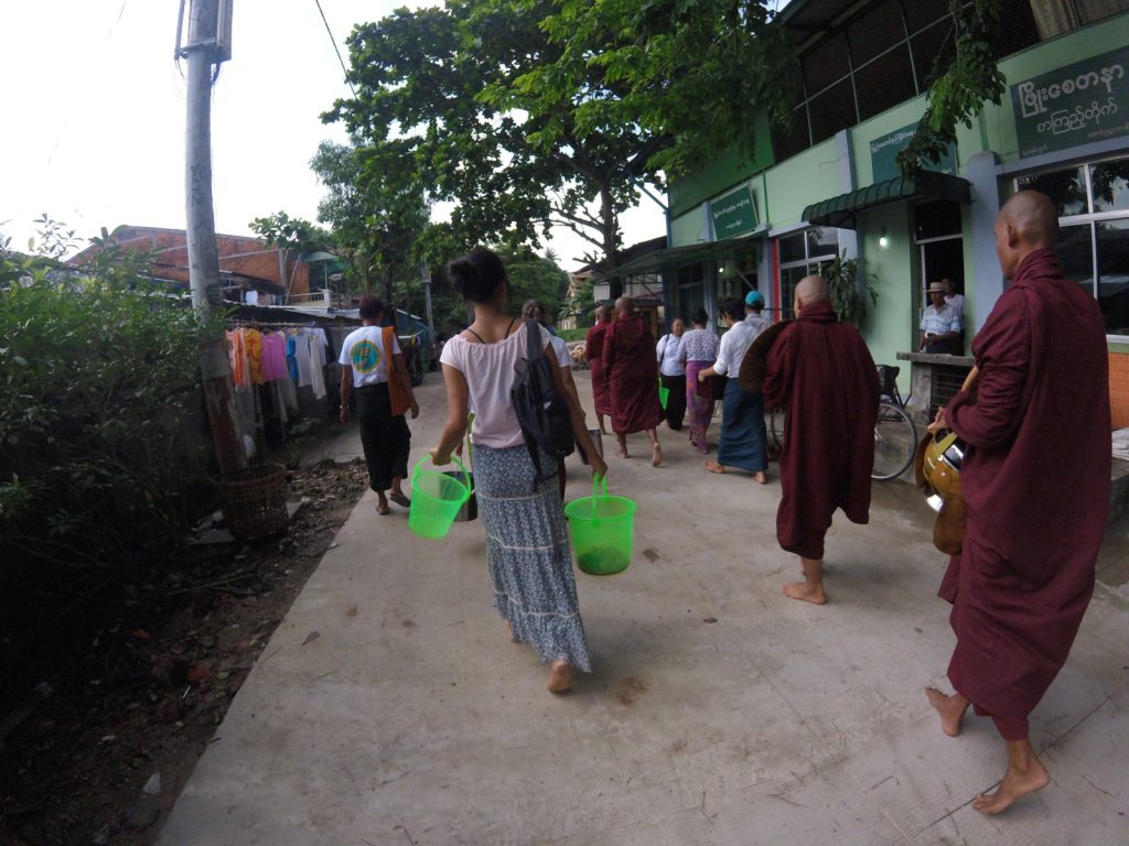 No, I wasn’t dreaming. I really was begging through the streets of Myanmar, walking next to a long line of monks. Women were so happy to come out with a pot of steamed rice and place one scoop into each monk’s container.