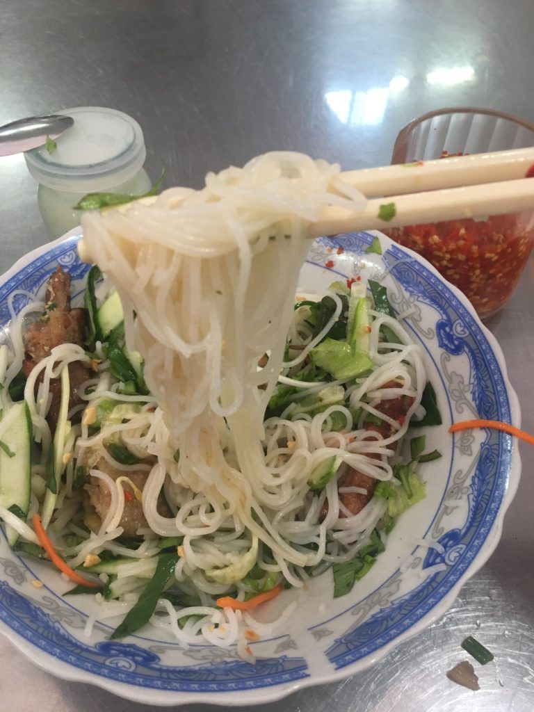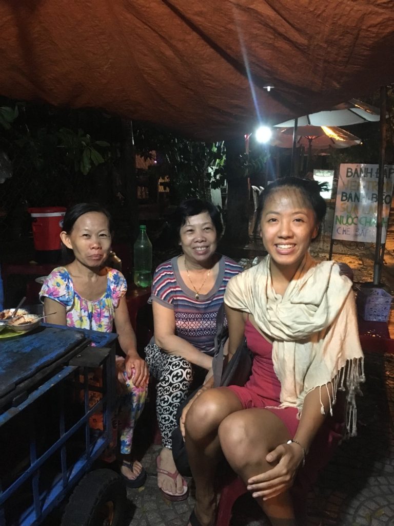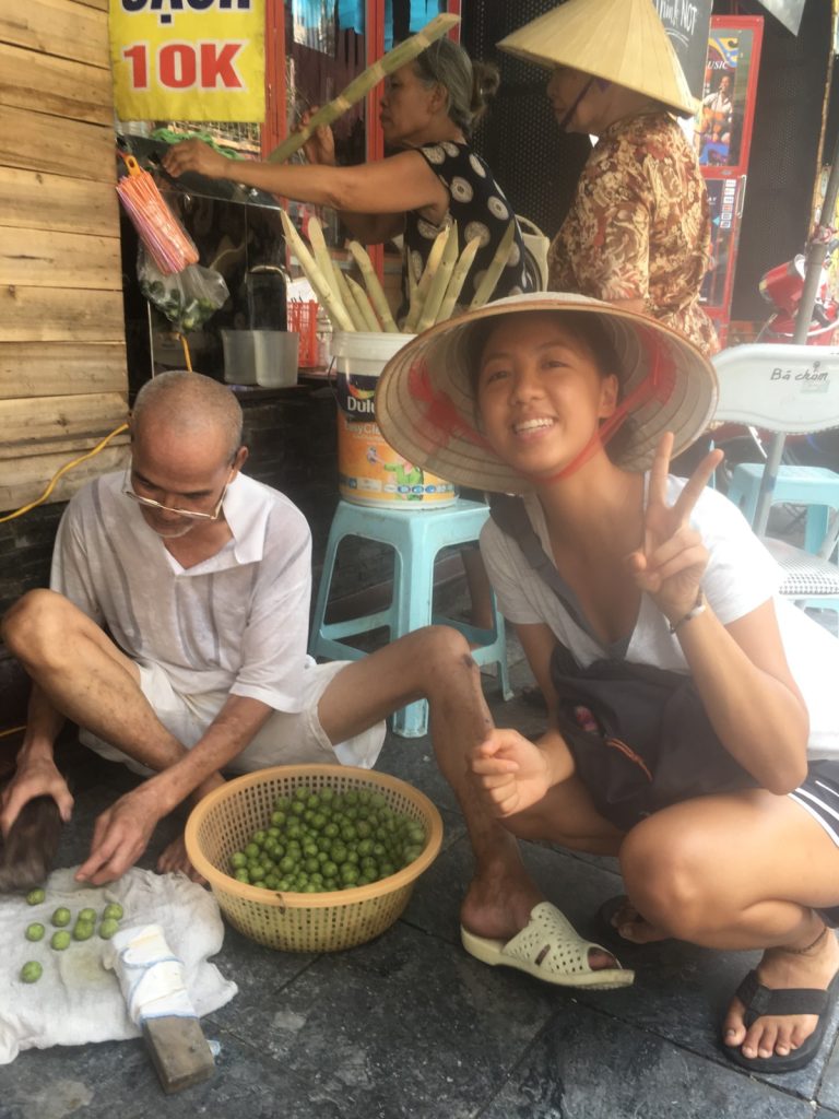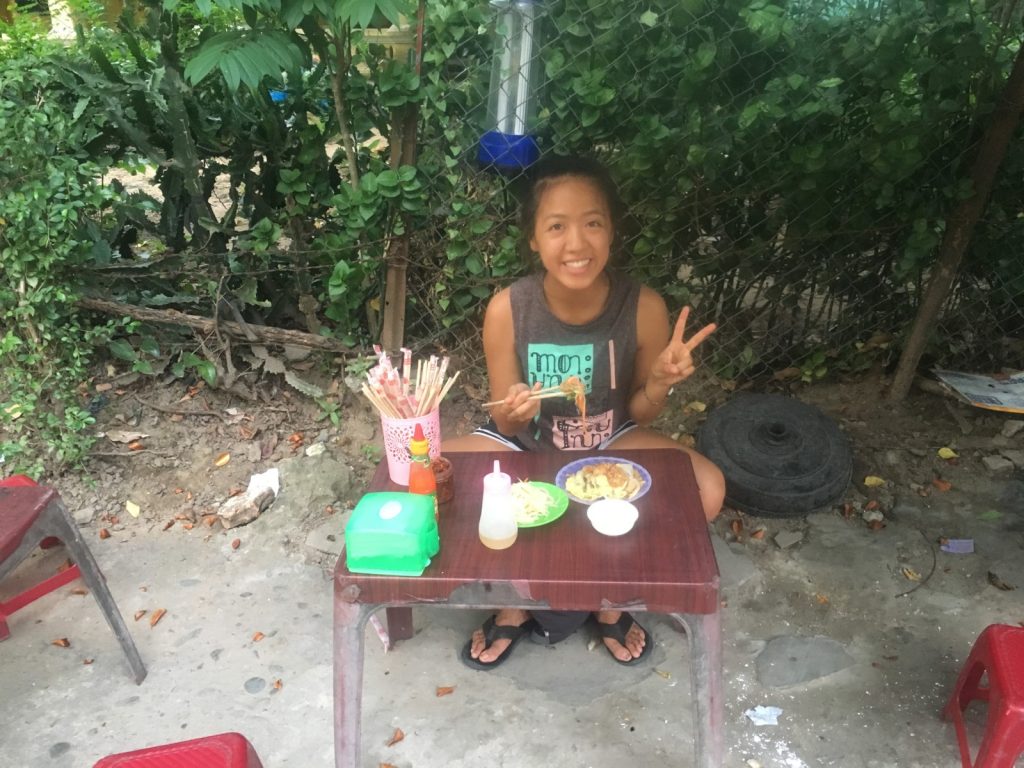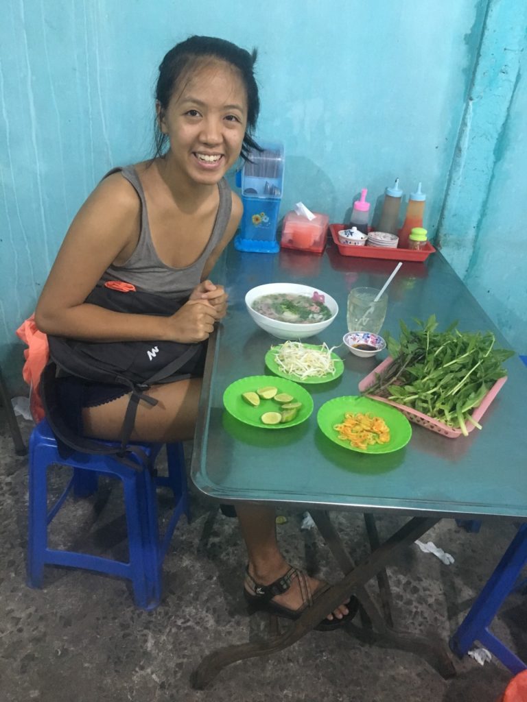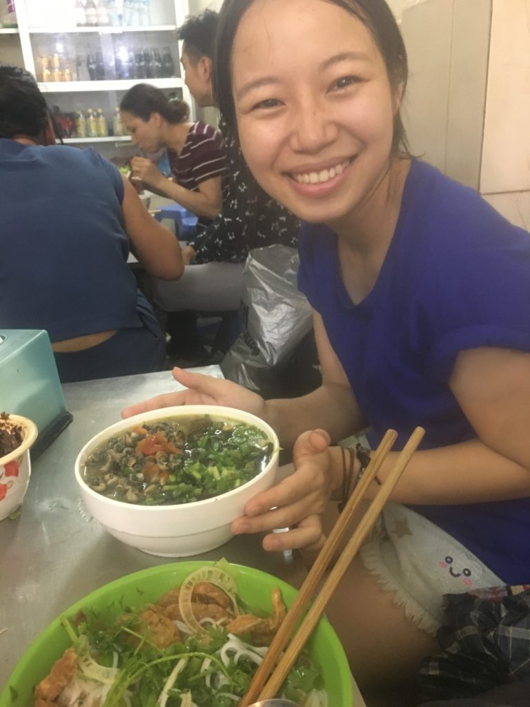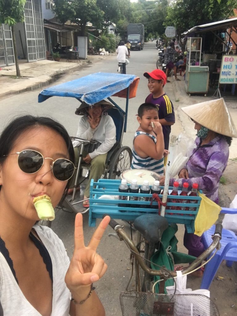 June 17, 2018 | Leave a comment So. How much street food can a hungry Vivian put away in fourteen days? According to my detailed Chasing Calories: Vietnam guide, it would be 47 distinct dishes and nine tropical fruits, not including the foods I ate repeatedly or did not write about. I guess the best way to start off would be with some heavy lifting. Phở đặc biệt Bún bò Huế Another Bún bò Huế Bún thịt nướng Phở bò Phở gà When I sit at a real food stall, squeezing into baby tables or chairs, I look around and find that the other customers are school kids or motorbike drivers. They usually love me so much they want to take my picture of me eating, with my phone, for me. But they can’t speak English, so they make gestures or the “ah” sound. While the majority of the site-seeing occurred on top of the table, this post is also meant to highlight some memorable moments from in between meals. There were the moments I understood too well, like this diaper-princess with her fan and phone and chips… …moments I think I will one day understand, like this gentleman chopping tapioca dough off of a metal roller into boiling water… …and moments I imagine I will never understand, like this lady who appeared to be charging children to gamble atop her bicycle in the Mekong Delta. In lots of cities around the world people drive without rules, but Vietnamese traffic has just one: the scooters only swerve and never stop. You just have to keep walking straight and chewing the donuts that a lady forcefully shoved into your hands, to lower your anxiety. There were times when the language barrier wasn’t crossed, but didn’t matter. There were times when I was left speechless, staring at how foods were made. Nem lui Bánh tráng trứng Bún bò Huế There were the newborn Couchsurfing memories. In Hanoi, we were four girls sleeping in a one-room apartment. Four happy girls. Four happy girls with narrow alleys of culinary genius and cheap laundry surrounding us. We didn’t have AC. I ran through convenience stores trying to find the perfect draft of AC to dry out my healing tattoo. Two weeks before the start of my senior year in university, my adventures of unpaid lodging were still going strong in Saigon. I became a bookworm by day… …and a waitress by night. At tourist restaurant Royal Saigon, my job as a couch surfer was to use my fluency in English and Mandarin to kindly ask for a review. This would maintain our competitive ranking as a top-hit on Google and TripAdvisor. I scrubbed their glass door so hard that I ran into it immediately after. The security cameras caught it all. I took myself to the Mekong Delta but didn’t want to take a tour. So I had more beef phở when it was raining. And drank more drip coffee when it wasn’t. Once I lit a lantern and set it free on a river. Another time I had a drink with an influential travel blogger who had more than 30,000 followers on Instagram. Alyssa now has 202,000. I made a lot of info graphics on what I was eating. And finally, I continued my love affair with dragonfruit, from the top of the country… …to the center… …to the sleeper buses where the only seating was in the form of bunk beds… …to the bottom. Cảm ơn Vietnam!