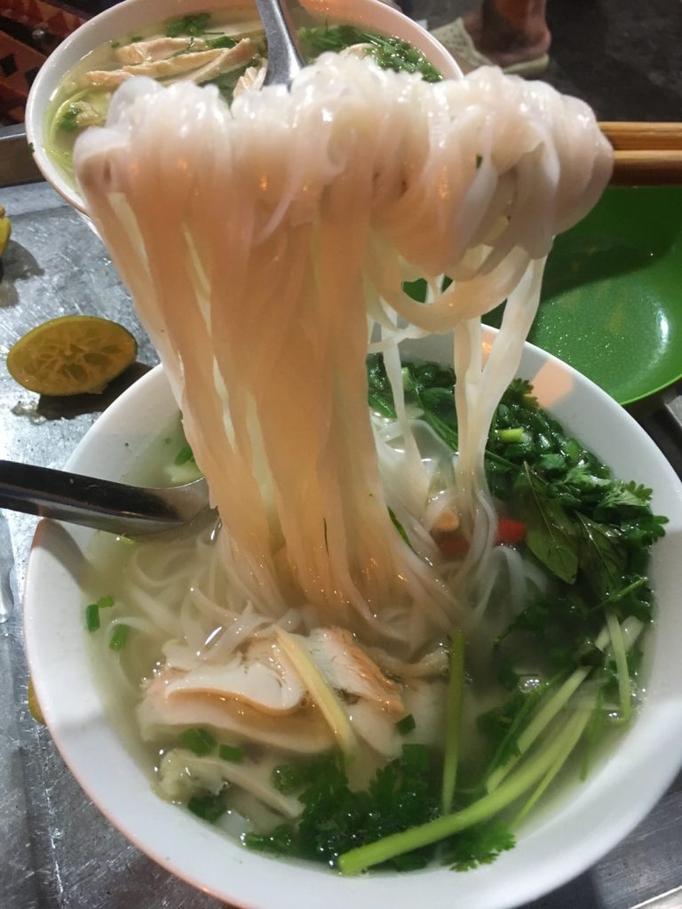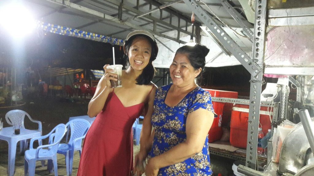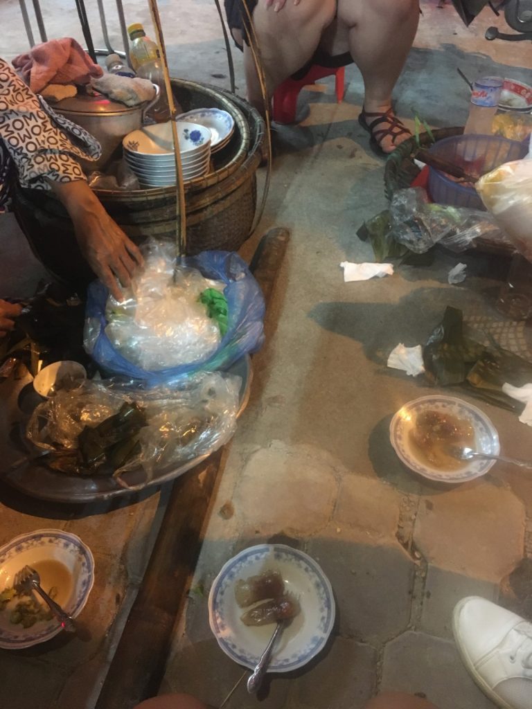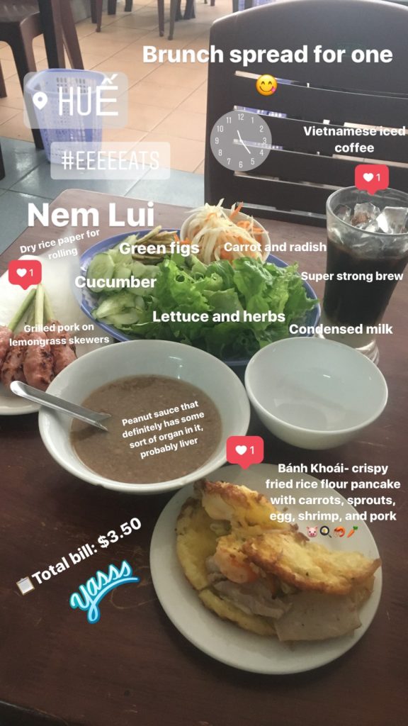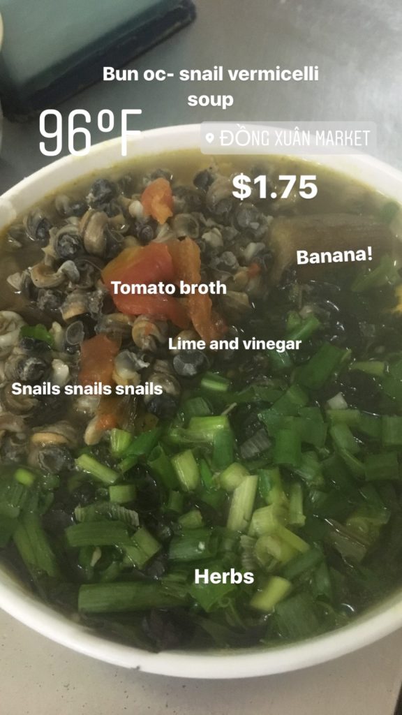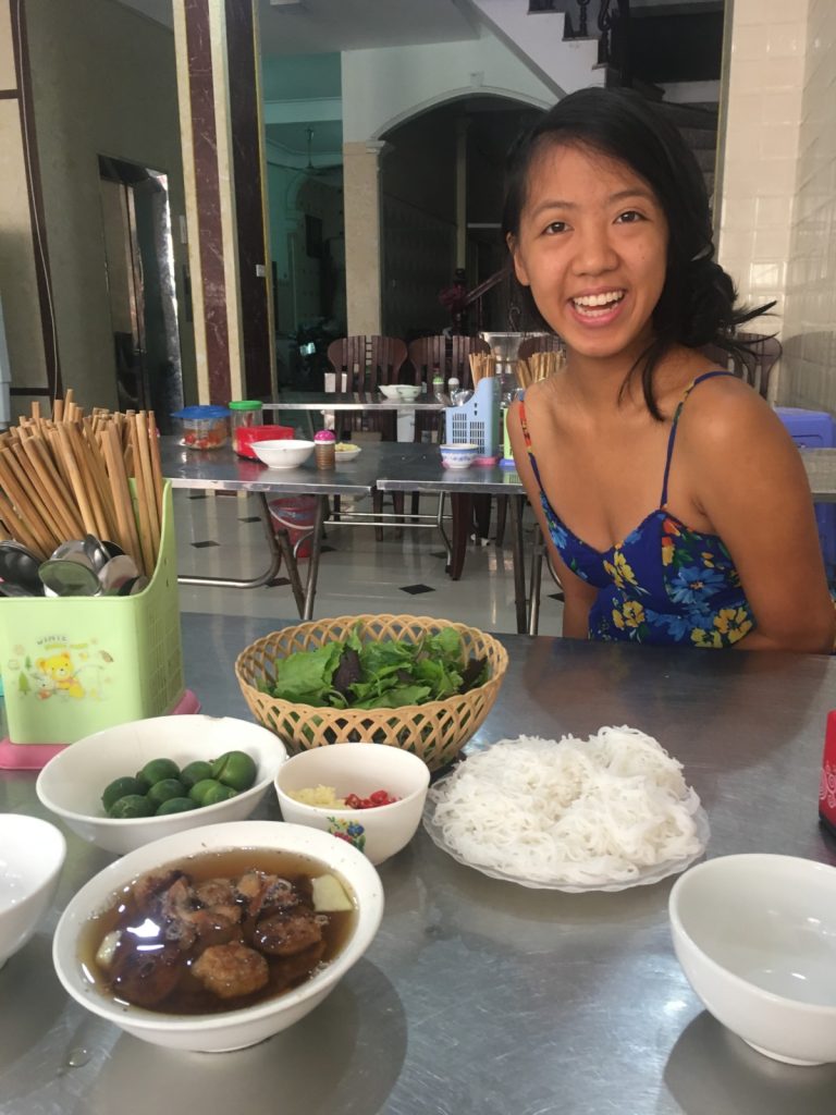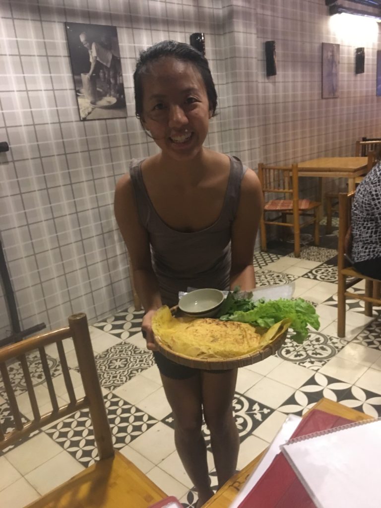 June 17, 2018 | Leave a comment So. How much street food can a hungry Vivian put away in fourteen days? According to my detailed Chasing Calories: Vietnam guide, it would be 47 distinct dishes and nine tropical fruits, not including the foods I ate repeatedly or did not write about. I guess the best way to start off would be with some heavy lifting. Phở đặc biệt Bún bò Huế Another Bún bò Huế Bún thịt nướng Phở bò Phở gà When I sit at a real food stall, squeezing into baby tables or chairs, I look around and find that the other customers are school kids or motorbike drivers. They usually love me so much they want to take my picture of me eating, with my phone, for me. But they can’t speak English, so they make gestures or the “ah” sound. While the majority of the site-seeing occurred on top of the table, this post is also meant to highlight some memorable moments from in between meals. There were the moments I understood too well, like this diaper-princess with her fan and phone and chips… …moments I think I will one day understand, like this gentleman chopping tapioca dough off of a metal roller into boiling water… …and moments I imagine I will never understand, like this lady who appeared to be charging children to gamble atop her bicycle in the Mekong Delta. In lots of cities around the world people drive without rules, but Vietnamese traffic has just one: the scooters only swerve and never stop. You just have to keep walking straight and chewing the donuts that a lady forcefully shoved into your hands, to lower your anxiety. There were times when the language barrier wasn’t crossed, but didn’t matter. There were times when I was left speechless, staring at how foods were made. Nem lui Bánh tráng trứng Bún bò Huế There were the newborn Couchsurfing memories. In Hanoi, we were four girls sleeping in a one-room apartment. Four happy girls. Four happy girls with narrow alleys of culinary genius and cheap laundry surrounding us. We didn’t have AC. I ran through convenience stores trying to find the perfect draft of AC to dry out my healing tattoo. Two weeks before the start of my senior year in university, my adventures of unpaid lodging were still going strong in Saigon. I became a bookworm by day… …and a waitress by night. At tourist restaurant Royal Saigon, my job as a couch surfer was to use my fluency in English and Mandarin to kindly ask for a review. This would maintain our competitive ranking as a top-hit on Google and TripAdvisor. I scrubbed their glass door so hard that I ran into it immediately after. The security cameras caught it all. I took myself to the Mekong Delta but didn’t want to take a tour. So I had more beef phở when it was raining. And drank more drip coffee when it wasn’t. Once I lit a lantern and set it free on a river. Another time I had a drink with an influential travel blogger who had more than 30,000 followers on Instagram. Alyssa now has 202,000. I made a lot of info graphics on what I was eating. And finally, I continued my love affair with dragonfruit, from the top of the country… …to the center… …to the sleeper buses where the only seating was in the form of bunk beds… …to the bottom. Cảm ơn Vietnam!