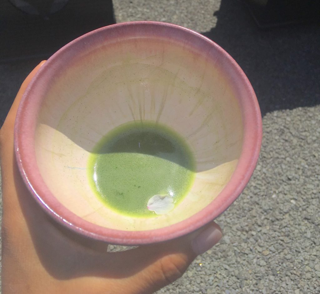 April 12, 2019 | Leave a comment When a sakura petal lands in your matcha, your heart skips a beat. Kofu, Japan. Day 424 When a sakura petal lands in your matcha, you suspect things may have just gone from 0 to 100. You blink twice and look again, because maybe you’ve just seen so many petals this sakura season that you’re hallucinating them too. You look down at it, and look around. Your sunny Saturday tea ceremony just got real. Was this an omen? What does it mean? The soft-spoken ladies who are serving tea to visitors scurry over in their kimonos and get on their tippy toes . They take a peek, one at a time, into your tea bowl. Some clap their hands and offer you nods of approval. Others look like they might almost be envious. When a sakura petal lands in your matcha, you admire how delicately it matches the color of the ceramic vessel containing this fragile moment. A drop of the faintest pink, thinner than a sheet of paper, keeping itself afloat amongst the foam. The tea foam a woman has recently created with strong muscles and a traditional bamboo whisk. You consider the fanaticism you have witnessed this hanami season.* The laborious hours poured into perfecting each cherry tree as they grow. The tedious preservation of the blossoms used to flavor food. The pink rice snacks sold in stores and pink eggs served in restaurants, all temporary, all in celebration of sakuras. You consider how unemotional the Japanese usually appear in public and contrast it with the expressions in front of you. You see that this isn’t some Starbucks marketing gimmick. This isn’t the next fancy drink everyone has to have. This is better. Irreproducible. When a sakura petal lands in your matcha, your heart skips a beat and you take a moment of gratitude. Then you gulp down the green and pink contents of your bowl, and humbly smile back at the universe, who just marked you with a sign which you do not yet fully understand. *Hanami (花見)— Japanese tradition of appreciating the ever-changing beauty of flowers, often as an outdoor social gathering underneath sakura (cherry blossom) trees during bloom season.