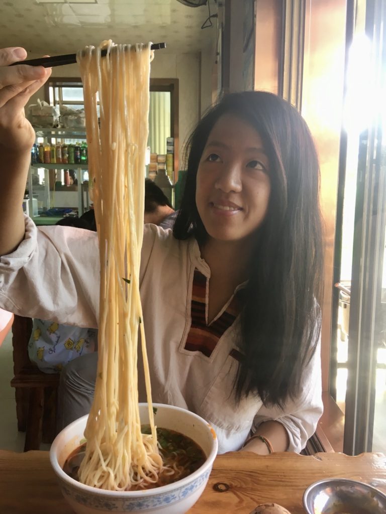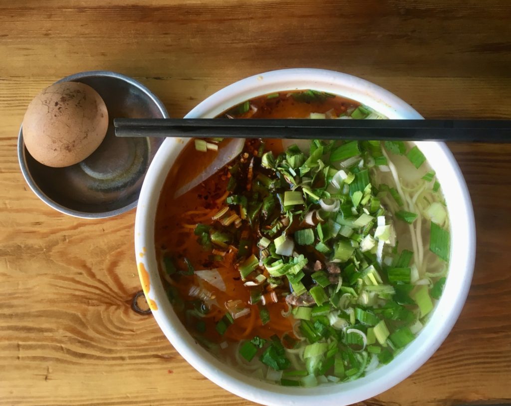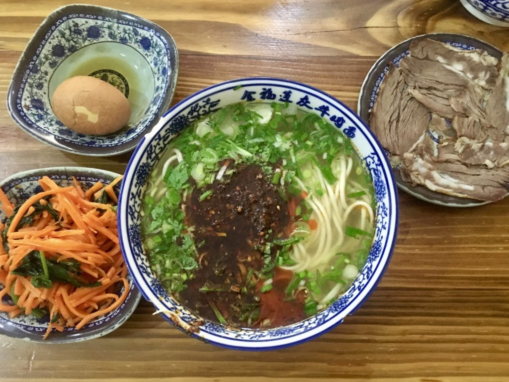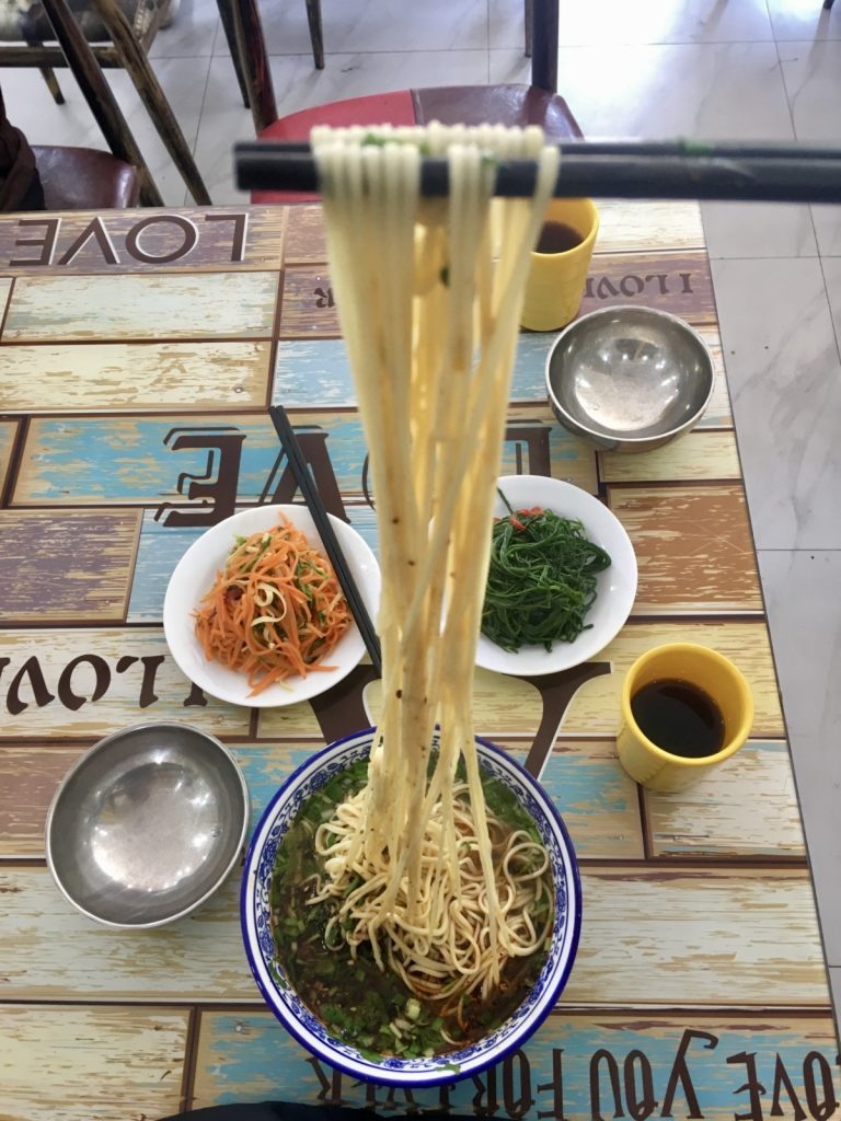 December 3, 2019 | Leave a comment A wide, steamy bowl of broth. Winter radish and bits of chopped beef blended in. A nest of soft, thin, hand-pulled noodles. A dark puddle of chili oil. Green onion garnish. Lanzhou, Gansu, China. The World’s Best Beef Noodles 牛肉面 (niú ròu miàn). Beef noodles. A cornerstone dish to the Chinese cuisine, for three straightforward reasons: it’s simple, delicious, and one dollar. Lanzhou, Gansu, China. This post honors the Lanzhou-style beef noodles, not to be confused with Sichuan or Taiwanese-style beef noodles. The Lanzhou-style is traditionally prepared by the Hui people. 回族人 (Huí zú rén), or the people of the Hui ethnicity, are mainly found in Northwest China, practice the Islamic faith, and posolutely know how to cook up some noods. The epicenter of this Chinese soul food is unsurprisingly Lanzhou, the capital of the Gansu province. The noodle bowls I had throughout the rest of Gansu, as well as in the bordering regions in the Qinghai province, that were just as heavenly. The closer one is to Gansu, the more authentic the dish becomes. This authenticity is well worth the pilgrimage. Lanzhou, Gansu, China. The kitchen of beef noodle shops is a stage open for public viewing. Steam clouds ascend from metal vats of broth. A team of sweaty workers divide the roles of noodle cooking. The one in charge of noodle-pulling, usually a Hui dude wearing his taquiyah skullcap, stretches a shiny ball of dough. Once the dough reaches the length of the noodle-puller’s wingspan, he loops it on itself, and repeats the technique half a dozen times, each tug halving the diameter of the noodles until they reach an impossible thinness*. Xining, Qinghai, China. So technically, a bowl of beef pulled noodles is actually just a bowl of one extra long noodle. One noodle per bowl. One extra long noodle that’s so long, it’s perfect for two ladies to share (though I consistently smashed whole portions), that is. In one elegant fling, the elongated, stringy dough loops draping from his forearm go soaring into the bubbling beef broth. The menus at these shops tend to offer other noodle varieties, usually stir-fried, saucier, and with more vegetables. Avoid them if you feel even the smallest inkling of indecision. Classic soupy beef noodles are the safe bet to post-prandial satisfaction. Bottom and left = safe and soupy, top and right = risky and saucy. For devout customers, beef noodles are a breakfast ritual, no days missed. Most noodle shops therefore sell out by early afternoon. Purists will emerge from their homes every morning at five sharp, hustling to their favorite joints in order to claim the first bowls of the day. Unable to accept broth tainted with the noodle starch of previous customers, only noodles cooked in virgin broth can meet their high standards. This first serving is known as 头汤面 (tóu tāng miàn), literally translating to “leading soup noodles.” Zhangye, Gansu, China. Upon entering a noodle shop, the first step is to order and pay. The cashier will hand the customer a paper ticket with the type of noodles printed on it. Sliced beef is an extra dollar. Sides include tea-boiled eggs and colorful salads, both of which I recommend and cost 28 cents and can be ordered via finger-pointing. These extras are handed to the customer upon payment, or can be collected at their own station. Then a tray can be collected if provided, before going to the kitchen counter to retrieve chopsticks and hand the ticket to the worker in charge of garnishing and serving. Here one can specify for extra thin noodles, with “very thin” in Chinese being 很细 (hěn xì). Within minutes, the worker will place the corresponding noodle bowl in front of the customer, ask you much chili oil is desired, and ladle it on. Lanzhou, Gansu, China. The fresh noodles are ready to be carried to the dining table. Once seated, the hungry customer doesn’t have to worry about making noises during eating because the whole restaurant will already be full of slurping sounds. A ceramic pitcher on the table contains vinegar, used as an extra topping, but most people don’t use it as the noodles taste perfect as is. A self-service tap of hot tea should be located somewhere in the room. First meal in Lanzhou with all the extras. 牛肉面 becomes 牛肉拉面 (nīu ròu lā miàn), or beef pulled noodles/ beef ramen (lā miàn = ramen), outside of Gansu. Some shops go as far as to label themselves 兰州牛肉拉面 (lán zhōu níu ròu lā miàn), Lanzhou beef pulled noodles. Within Gansu, these extra characters are entirely unnecessary because of how omnipresent this dish is. Time-tested and gaining popularity, beef noodles have crept their way beyond China and into culinary scenes around the world. Globalization and commercialization have led to franchises and 24-hour beef noodle kitchens. For the truest experience, dine at crowded diners in non-tourist districts or consult native hostel staff. Anboer Beef Noodle Shop, Lanzhou, China. *The dough of pulled noodles has likely been laced with desert plant ash to increase its elasticity. Unfortunately, modern shops have turned to factory-produced powders, adding to the long list of health concerns in China’s food industry. Need a ride to Lanzhou? Consider taking the Chinese trains.