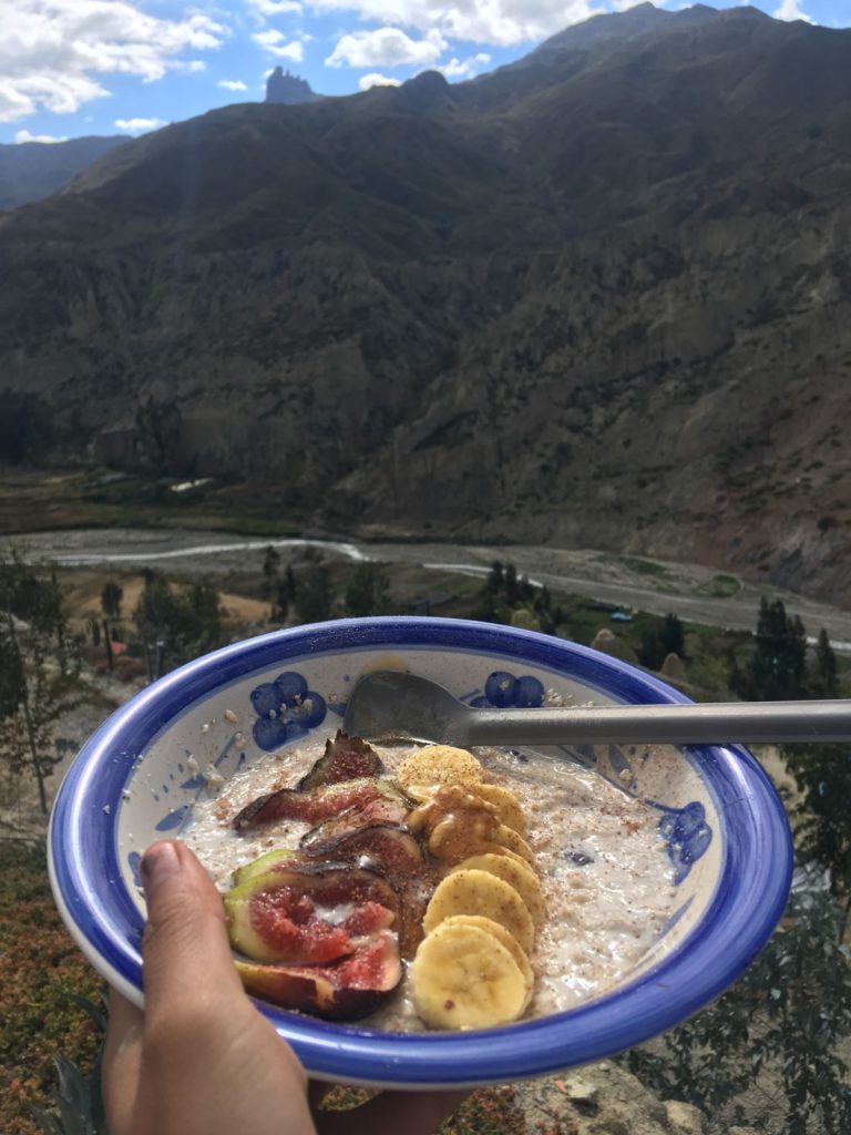 January 26, 2020 | Leave a comment Some favorite combinations for a wholesome breakfast on the trails. Chile 2018, shot by Fritz. Camping Oatmeal Three Ways Classic Oatmeal Raisin Ingredients 60g (2/3 cup) instant oatmeal 1 spoon chia seeds handful raisins 1 spoon crushed walnuts pinch of cinnamon water Instructions Fill pot with water and heat on stove until boiling. Turn stove off. Combine remaining ingredients in bowl. Mix with spoon to evenly distribute chia seeds. Slowly pour water over contents of bowl until just covered. Stir, let sit for two minutes, and add more water until oatmeal reaches desired consistency. Top with more nuts and cinnamon. Best paired with a mug of instant coffee or tea, which can be made with any remaining water, and a great view. Notes Alternatively, combine dry ingredients into a plastic zip bag before a trek begins. Do this for every morning you’ll need breakfast. Instead of step two, simply pour contents of bag into bowl. If using filtered water or water from a safe source, stove can be turned off just before water boils to save gas. If glamping or van camping, top with sliced banana and honey. Shredded coconut is another possible topping that gives the oatmeal an added layer of texture and fatty, subtly sweet flavor. If traveling in an area where fresh figs are available, definitely slice and top on oatmeal as well. Bolivia 2018. Apple Cinnamon Ingredients 60g (2/3 cup) instant oatmeal 1 spoon chia seeds 1 spoon dried apple, cut into pieces 1 spoon crushed walnuts pinch of cinnamon water Instructions Fill pot with water and heat on stove until boiling. Turn stove off. Combine remaining ingredients in bowl. Mix with spoon to evenly distribute chia seeds. Pour water over contents of bowl until just covered. Stir, let sit for two minutes, and add more water until oatmeal reaches desired consistency. Top with more nuts and cinnamon. Best paired with a mug of instant coffee or tea, which can be made with any remaining water, and a beautiful view. Notes Alternatively combine dry ingredients into a plastic zip bag before a trek begins, when packing gear and food. Do this for every morning you’ll need breakfast. Instead of step two, simply pour contents of bag into bowl. If using filtered water or water from a safe source, stove can be turned off just before water boils to save gas. If glamping or van camping, top with sliced banana and honey. Fresh apples may be used in place of dried. Chocolate Coconut Ingredients 60g (2/3 cup) instant oatmeal 1 spoon chia seeds 1 spoon shredded coconut 1/2 spoon cacao powder* 1 spoon crushed walnuts 1 spoon dried cranberries, optional water Instructions Fill pot with water and heat on stove until just before boiling. Turn stove off. Combine remaining ingredients in bowl. Mix with spoon to evenly distribute chia seeds. Slowly pour water over contents of bowl until just covered. Stir, let sit for two minutes, and add more water until oatmeal reaches desired consistency. Top with more nuts and coconut. Best paired with a mug of instant coffee or tea (which can be made with any remaining water) and a beautiful view. Notes Alternatively combine dry ingredients into a plastic zip bag before a trek begins. Do this for every morning you’ll need breakfast. Instead of step 2, simply pour contents of bag into bowl. *Chocolate drink mix or cocoa powder may be used instead of pure cacao powder. If using filtered water or water from a safe source, stove can be turned off just before water boils to save gas. If glamping or van camping, top with sliced banana and honey. If traveling in an area where fresh figs are available, definitely slice and top on oatmeal as well. Gear Needed Camping stove Cooking fuel Bowl Spoon For my bowl and spoon I religiously used my collapsible silicone container and Titanium long handle spoon.