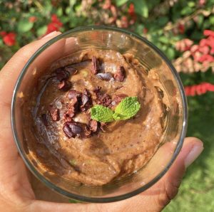 May 21, 2022 | Leave a comment cold ‘n’ creamy cacao that’ll keep ’em guessing for the hack pokhara, nepal mousse au avochoco v • gf serves two mousse1 ripe avocado25g fep-approved cacao powder50g coconut sugar30g liquid coconut oil70mL hemp-oat mylk/ vegan mylk/ water topcacao nibs2 fresh mint sprigspinch pink rock salt in a food processor add cacao powder.halve and slice avocado, scoop into food processor.add remaining mousse ingredients.divide into two glasses.accessorize.chill in fridge for at least one hour before serving. notes:when using coconut oil it is ideal that all ingredients are room temperatureimportant chocolate informationi only had south indian cacao beans, which i roasted and peeled into nibs and grinded into powderthe cacao was purchased from fishtail organic garden, lakeside, pokhara, nepali made my own mylk by blending a quarter-cup of oats and a teaspoon of hemp seed butter and strainingi made my own hemp seed butter: 250g hemp seeds, roasted and cooled 45g virgin coconut oil 1g pink rock salt grind in food processor chase more calories in my recipes archive.